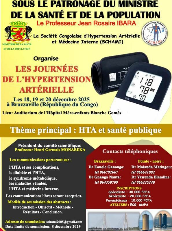 La Société congolaise d’hypertension artérielle et médecine interne (SCHAMI) organise les journées de l’hypertension artérielle, les 18, 19 et 20 décembre 2025 à Brazzaville (Republique du Congo)